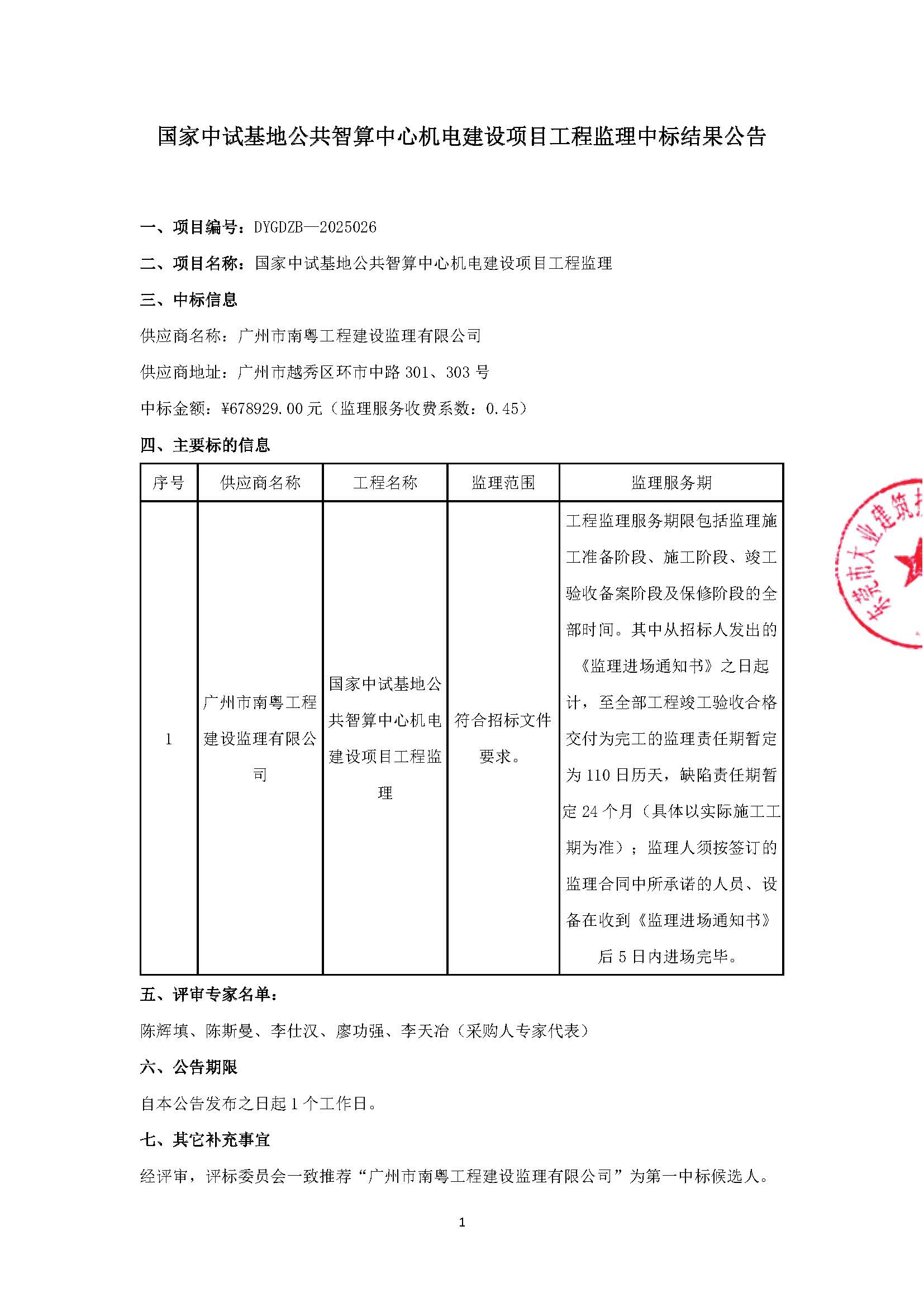 國家中試基地公共智算中心機電建設項目工程監(jiān)理中標結果公告