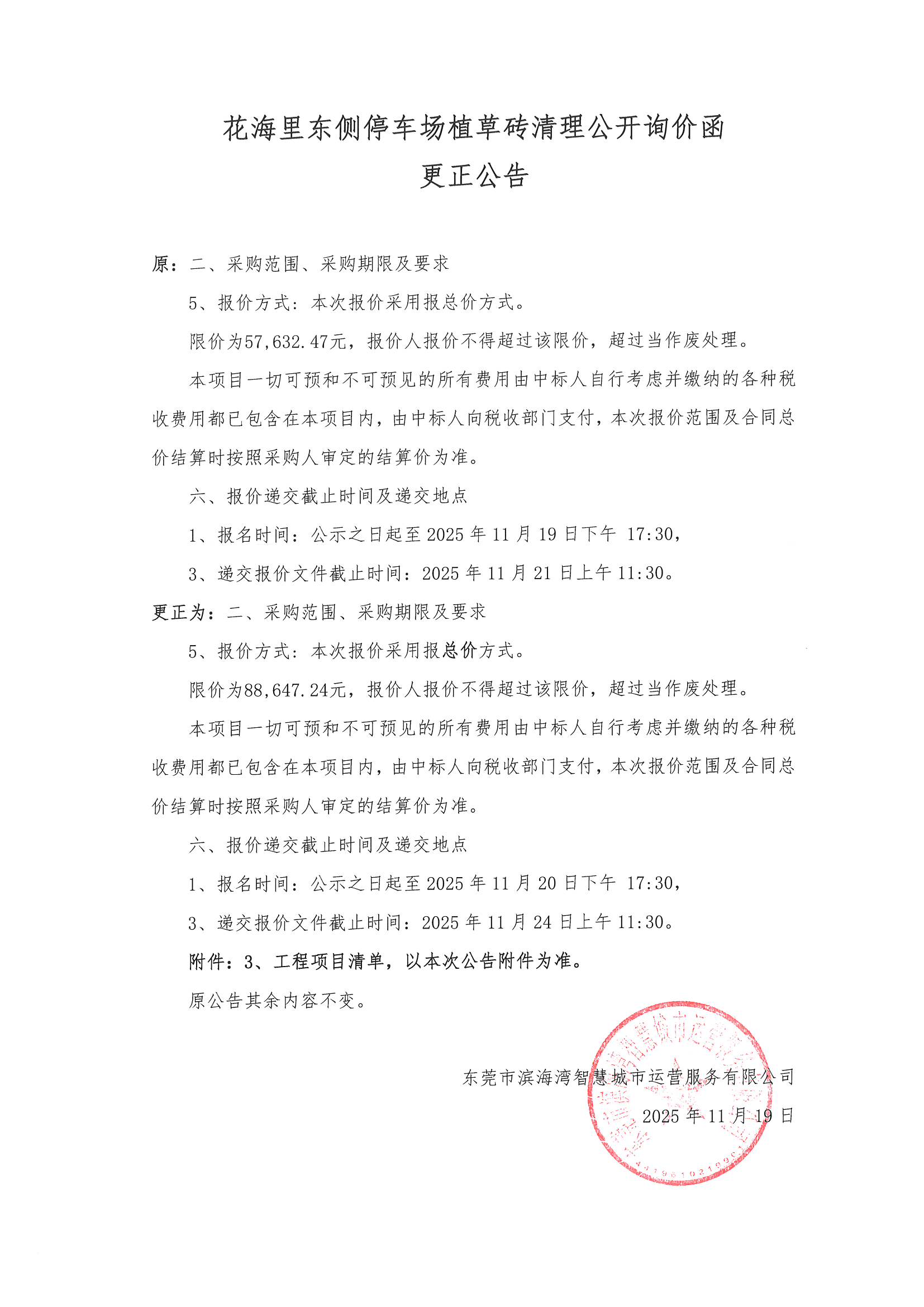 花海里東側(cè)停車場植草磚清理公開詢價(jià)函更正公告