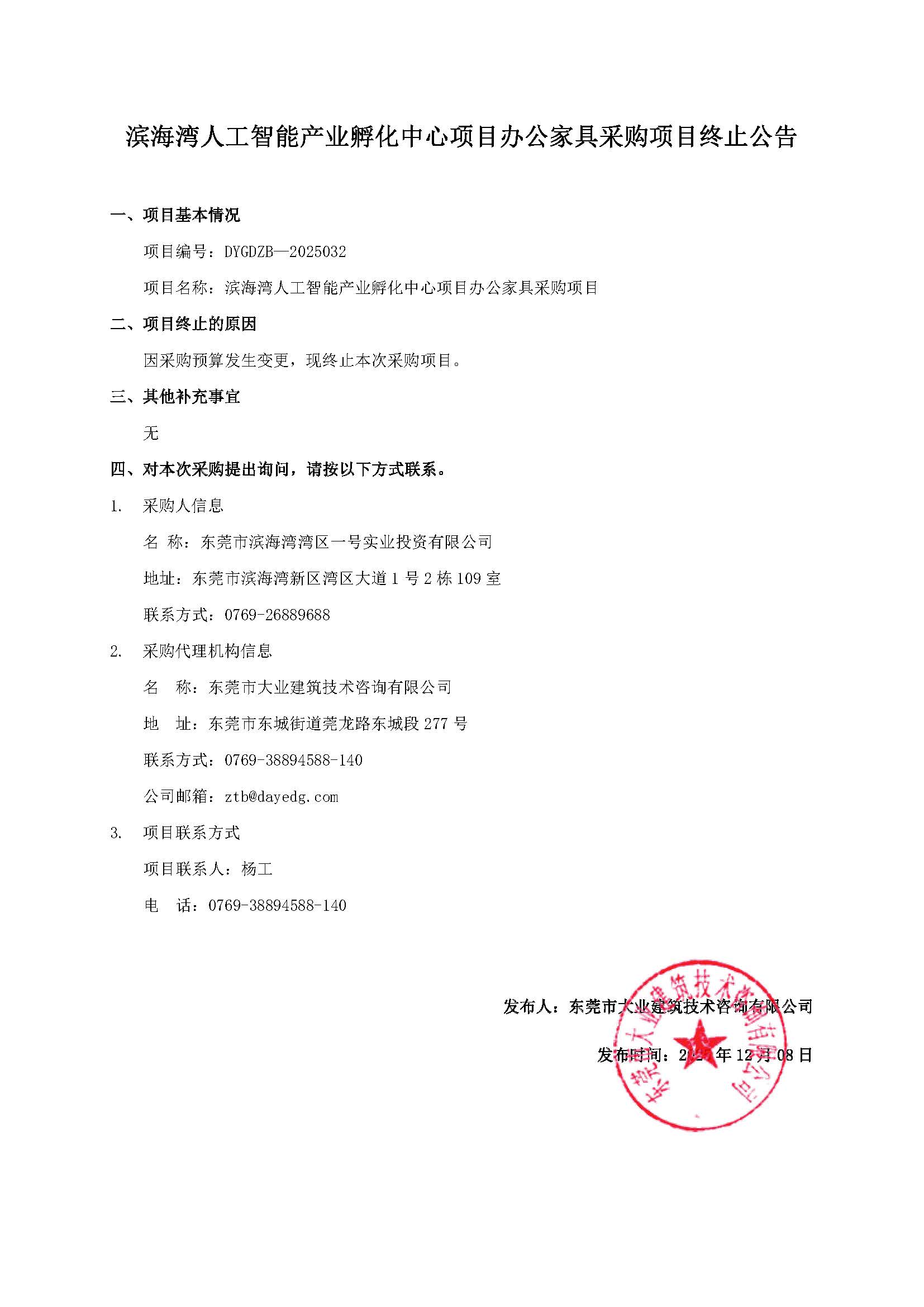 濱海灣人工智能產業(yè)孵化中心項目辦公家具采購項目終止公告