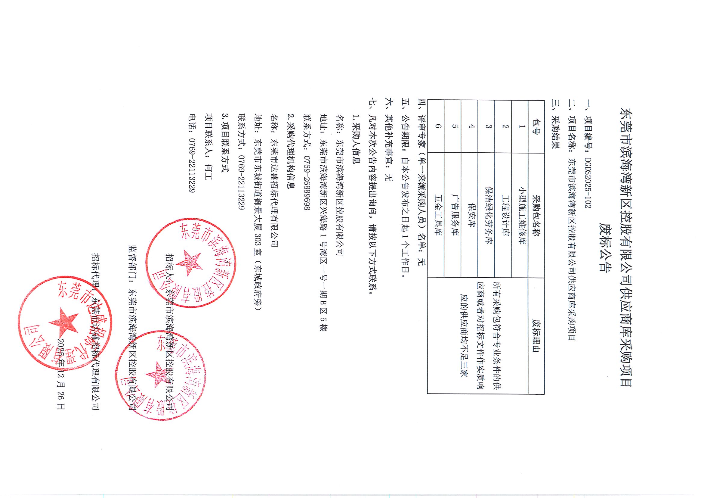 東莞市濱海灣新區(qū)控股有限公司供應(yīng)商庫采購項目廢標(biāo)公告