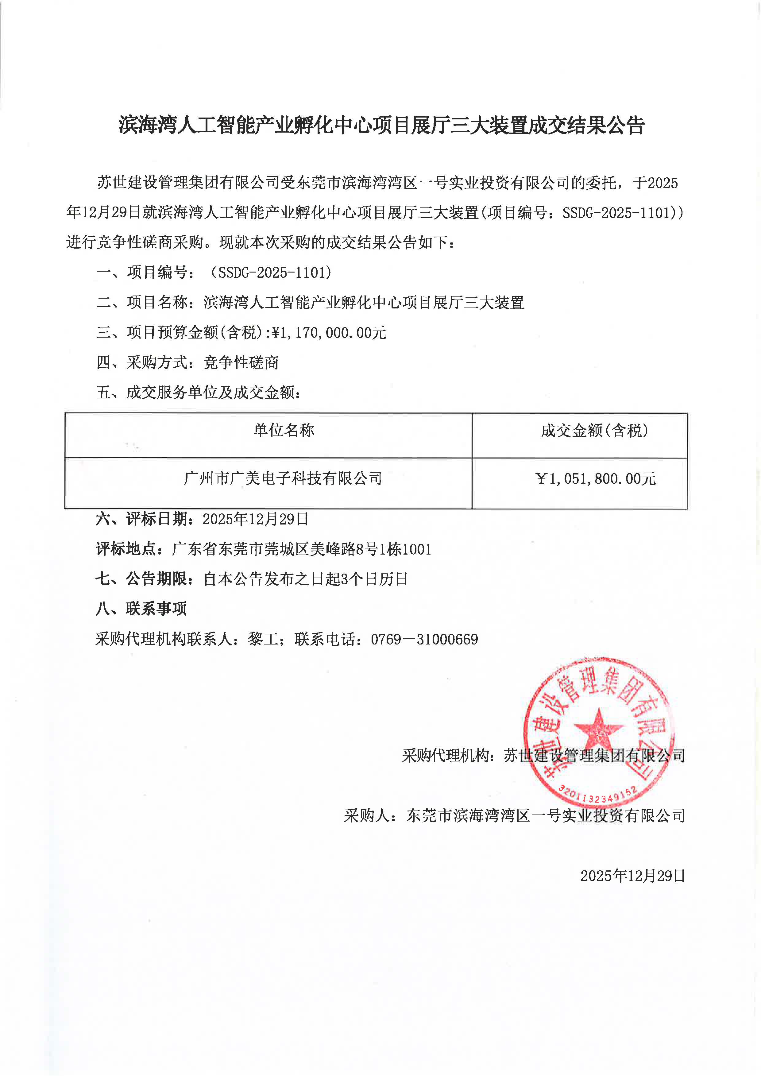 濱海灣人工智能產業(yè)孵化中心項目展廳三大裝置成交結果公告