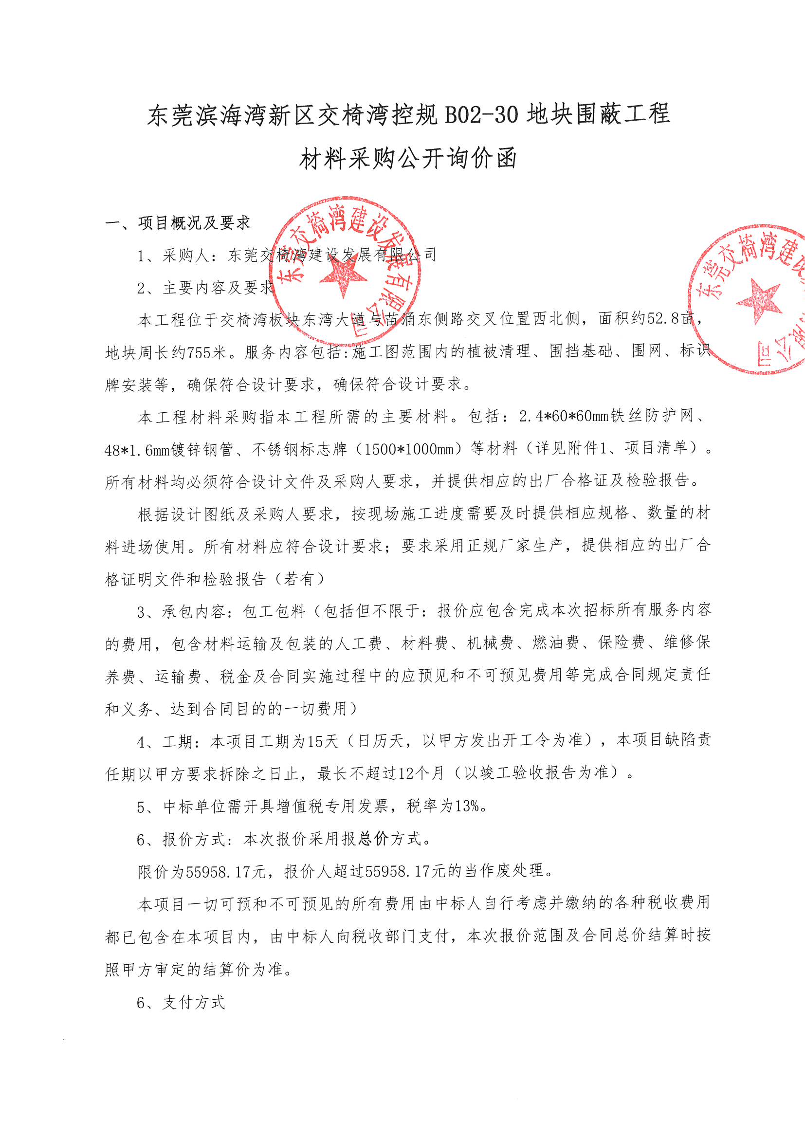 東莞濱海灣新區(qū)交椅灣控規(guī)B02-30地塊圍蔽工程材料采購公開詢價(jià)函