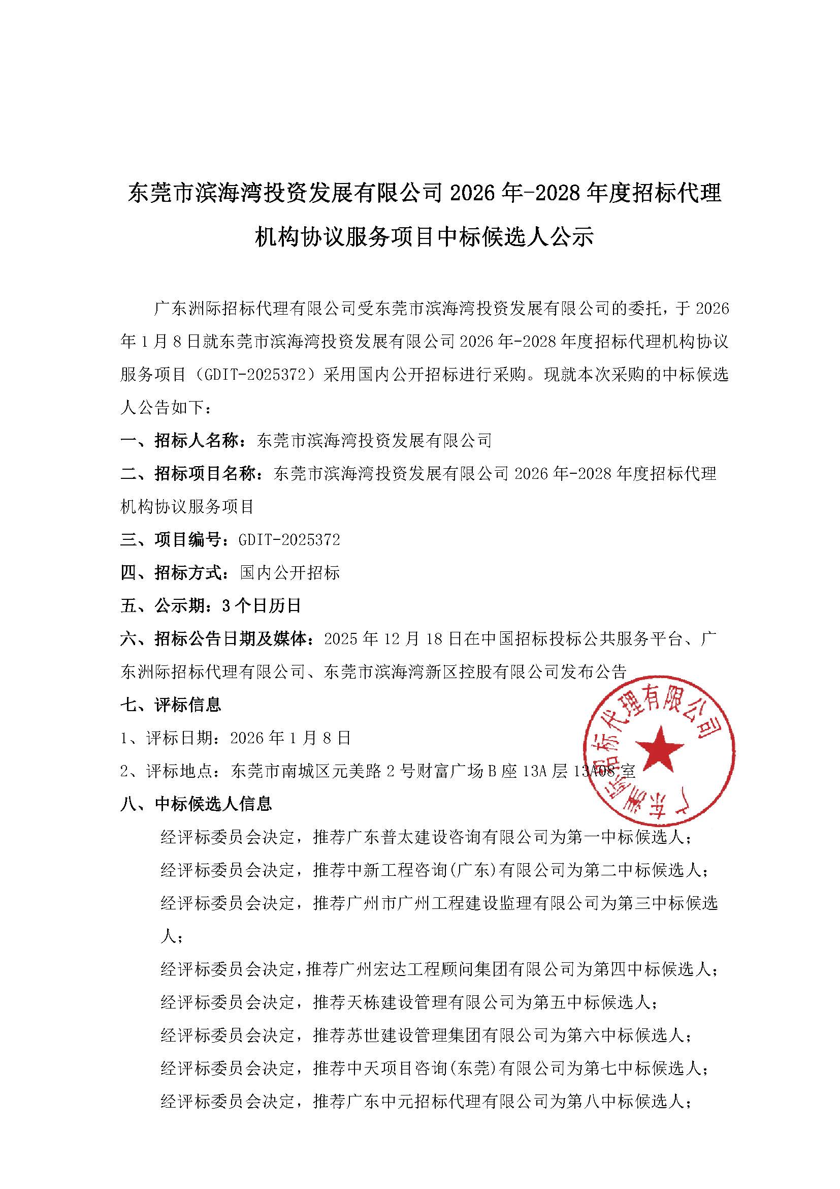 東莞市濱海灣投資發(fā)展有限公司2026年-2028年度招標(biāo)代理機(jī)構(gòu)協(xié)議服務(wù)項(xiàng)目中標(biāo)候選人公示