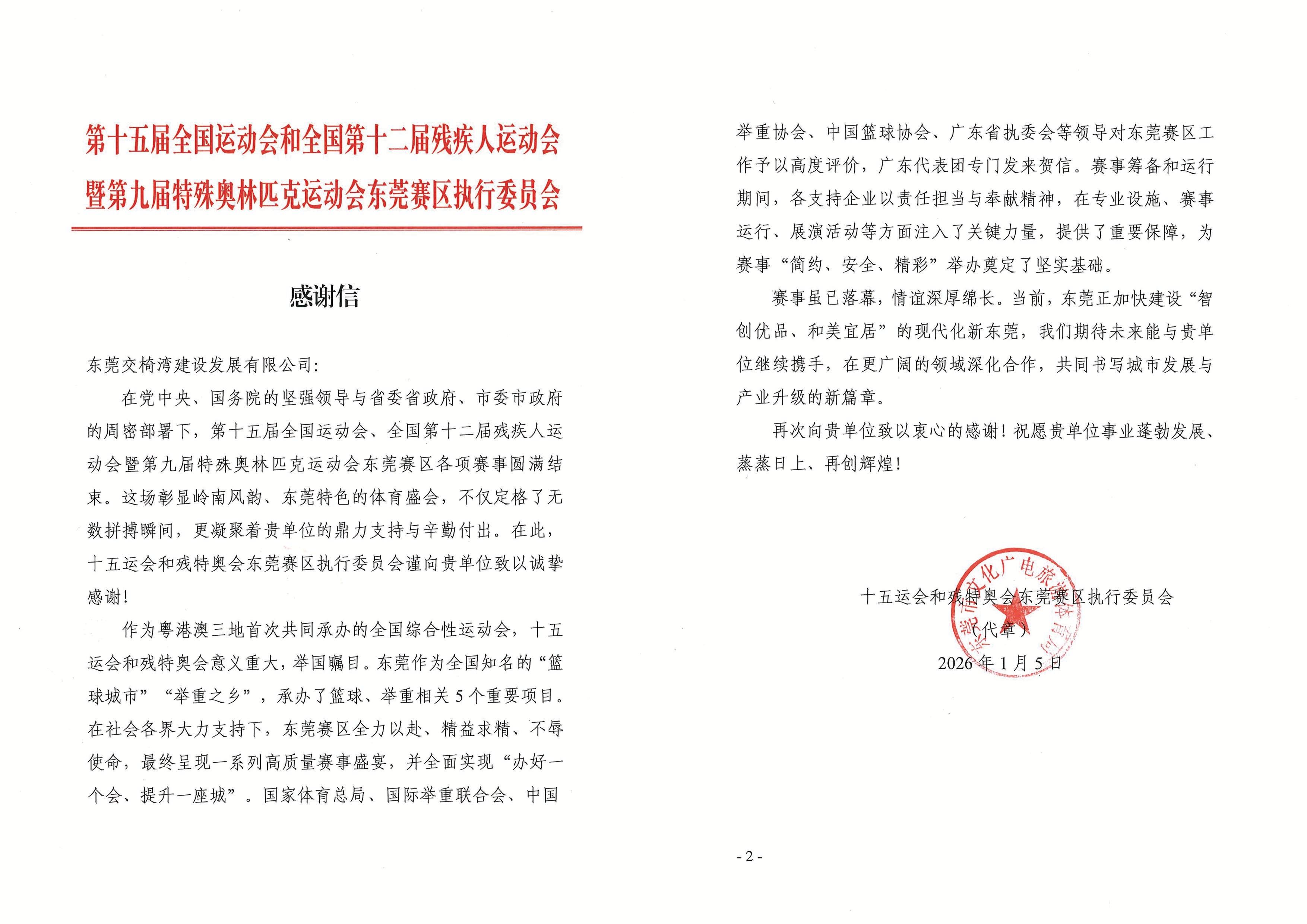 近日,濱海灣控股下屬全資子公司-東莞交椅灣建設(shè)發(fā)展有限公司(簡稱“交椅灣發(fā)展公司”)收到第十五屆全國運(yùn)動(dòng)會(huì)和全國第十二屆殘疾人運(yùn)動(dòng)會(huì)暨第九屆特殊奧林匹克運(yùn)動(dòng)會(huì)廣東賽區(qū)執(zhí)行委員會(huì)、東莞賽區(qū)執(zhí)行委員會(huì)分別發(fā)來的《感謝信》。