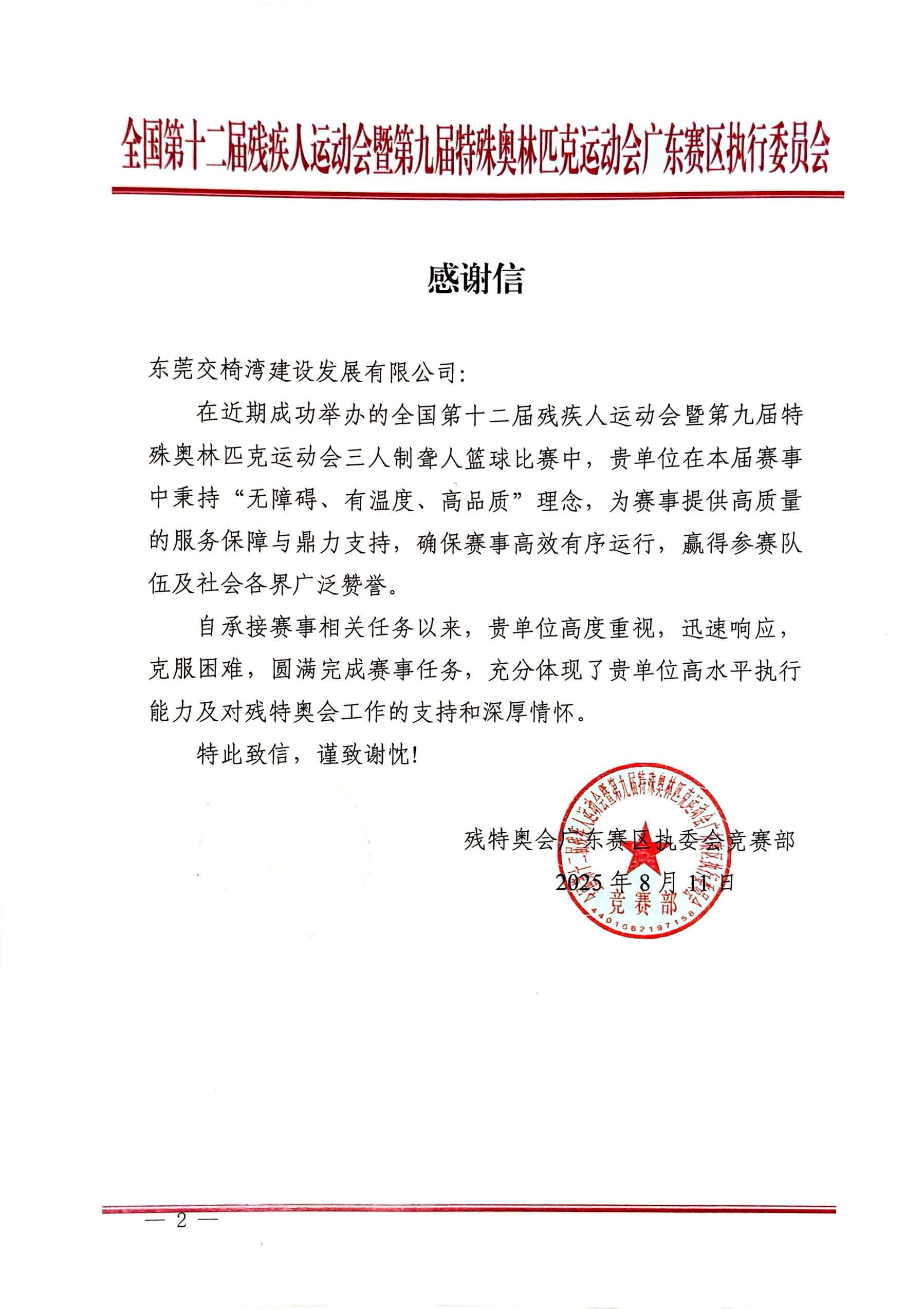 《感謝信》提到:“貴單位在本屆賽事中秉持‘無障礙、有溫度、高品質(zhì)’理念,為賽事提供高質(zhì)量的服務(wù)保障與鼎力支持,確保賽事高效有序運(yùn)行,贏得參賽隊(duì)伍及社會(huì)各界廣泛贊譽(yù)”,“高度重視,迅速響應(yīng),克服困難,圓滿完成賽事任務(wù),充分體現(xiàn)了貴單位高水平執(zhí)行能力及對殘?zhí)貖W會(huì)工作的支持和深厚情懷”,對交椅灣發(fā)展公司提供的高標(biāo)準(zhǔn)、高質(zhì)量監(jiān)理服務(wù)與工程質(zhì)量管控工作予以高度贊揚(yáng)和衷心感謝。
