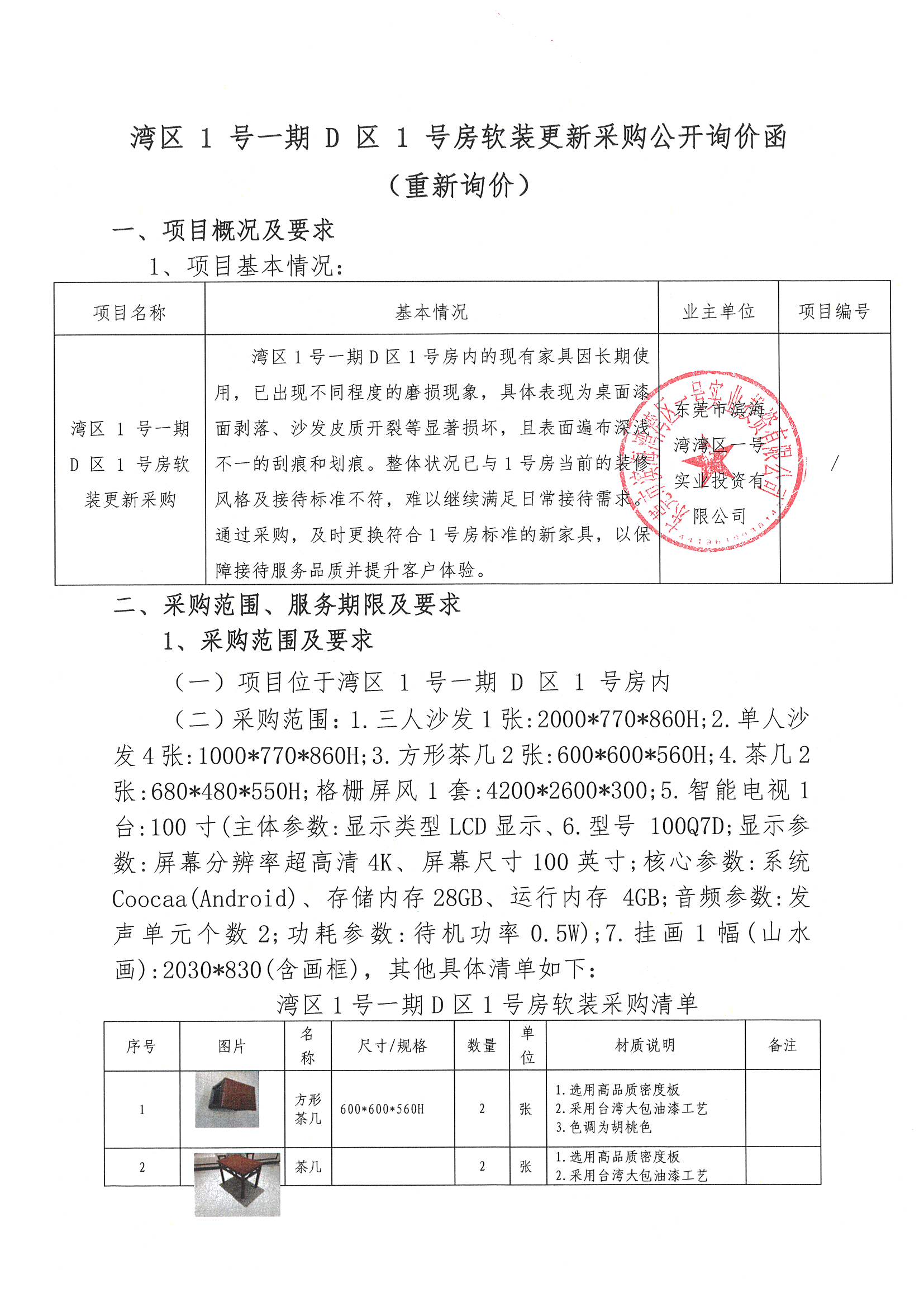 附件-灣區(qū) 1 號一期 D 區(qū) 1 號房軟裝更新采購公開詢價函(重新詢價)