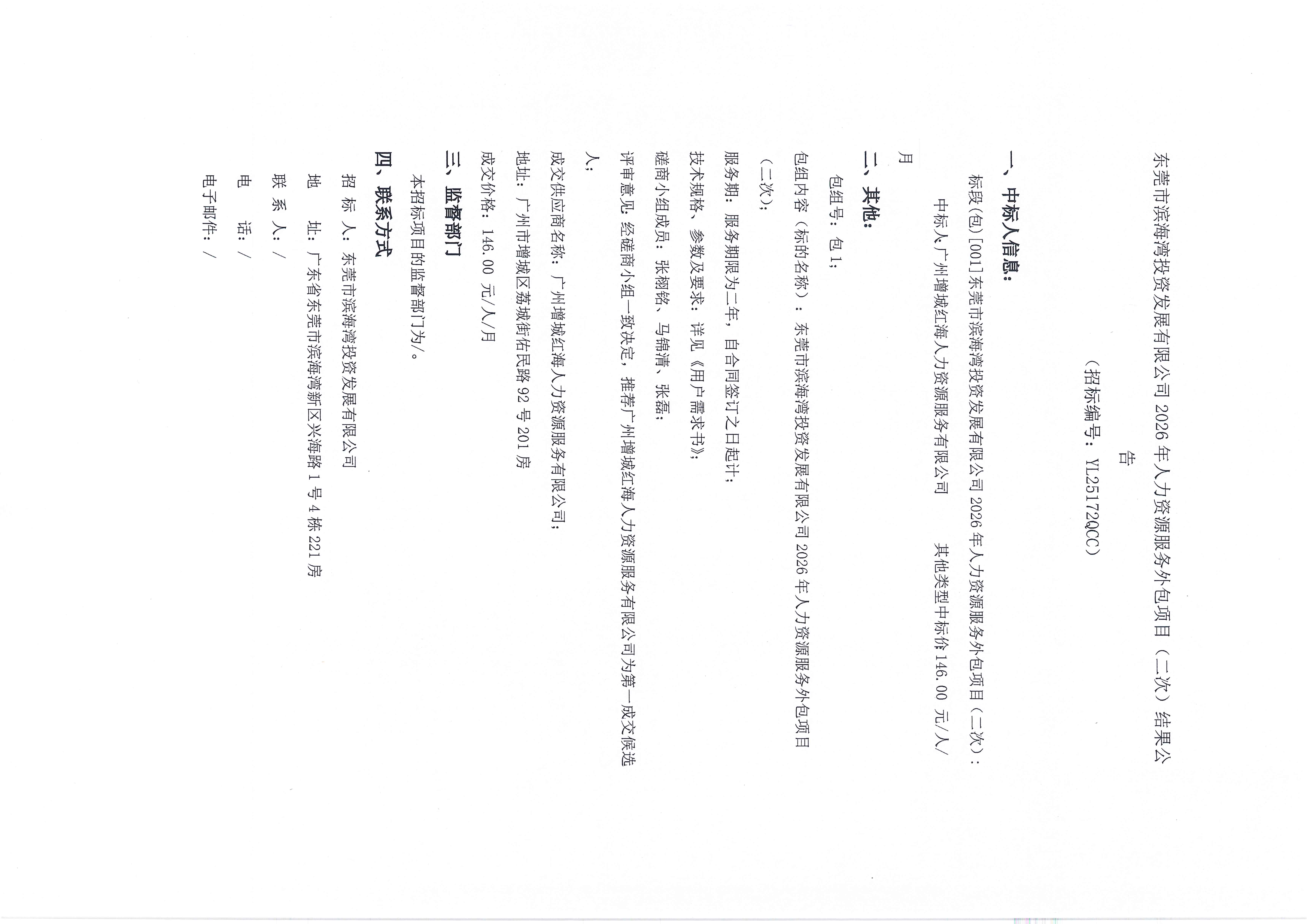 東莞市濱海灣投資發(fā)展有限公司2026年人力資源服務(wù)外包項(xiàng)目(二次)結(jié)果公告