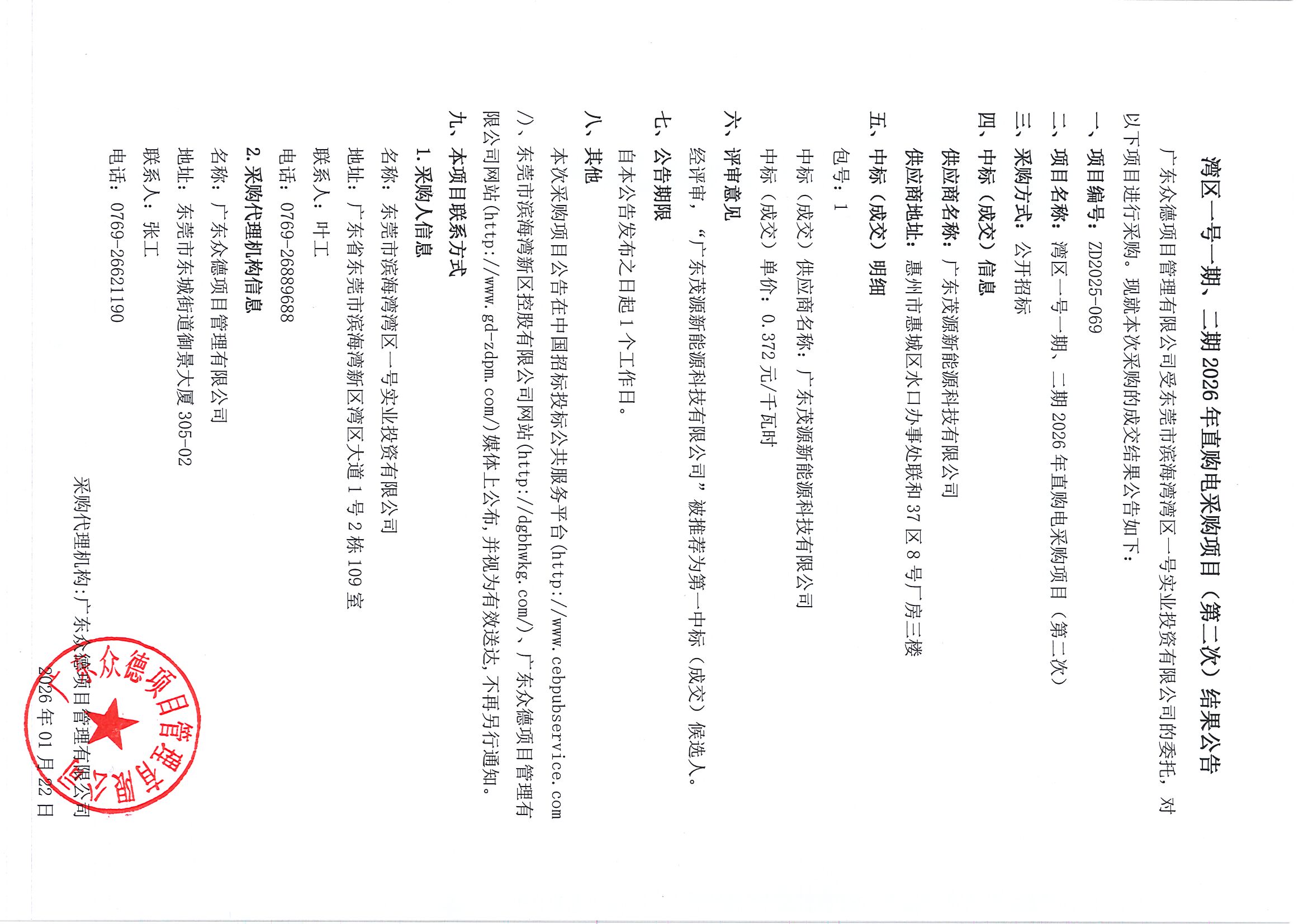 灣區(qū)一號一期、二期2026年直購電采購項目(第二次)結果公告