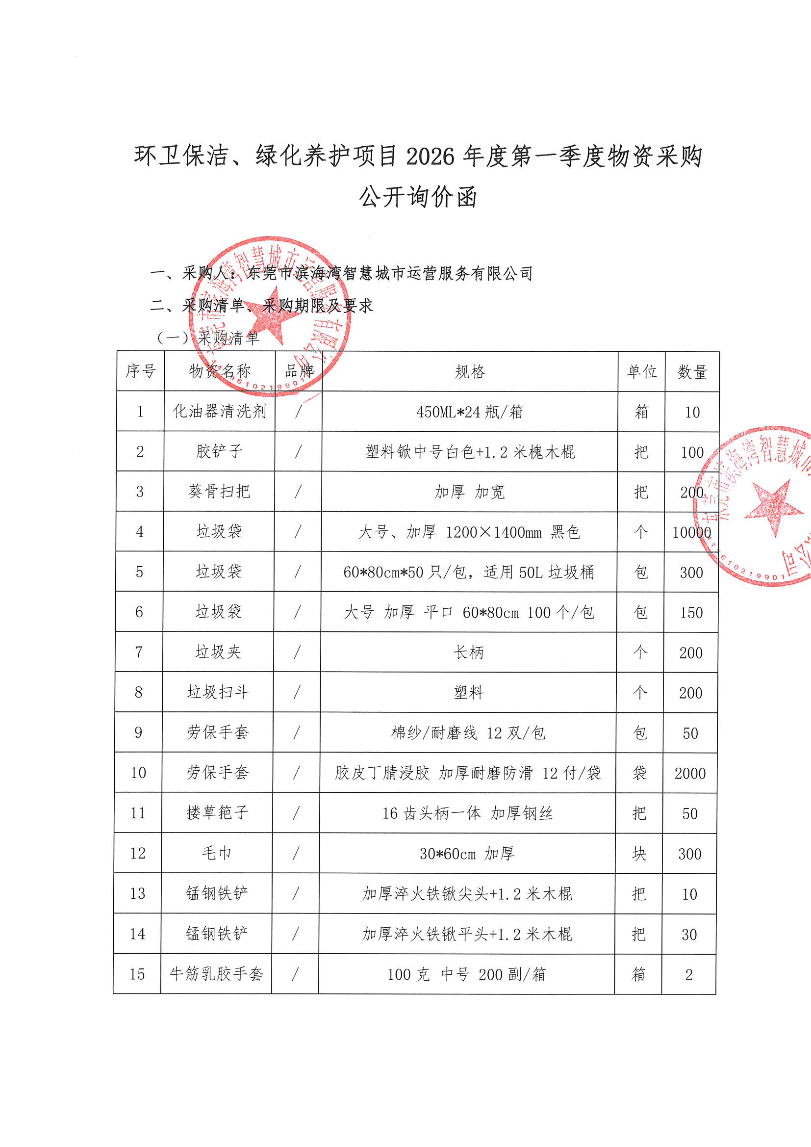 環(huán)衛(wèi)保潔、綠化養(yǎng)護(hù)項(xiàng)目2026年度第一季度物資采購(gòu)公開(kāi)詢價(jià)函