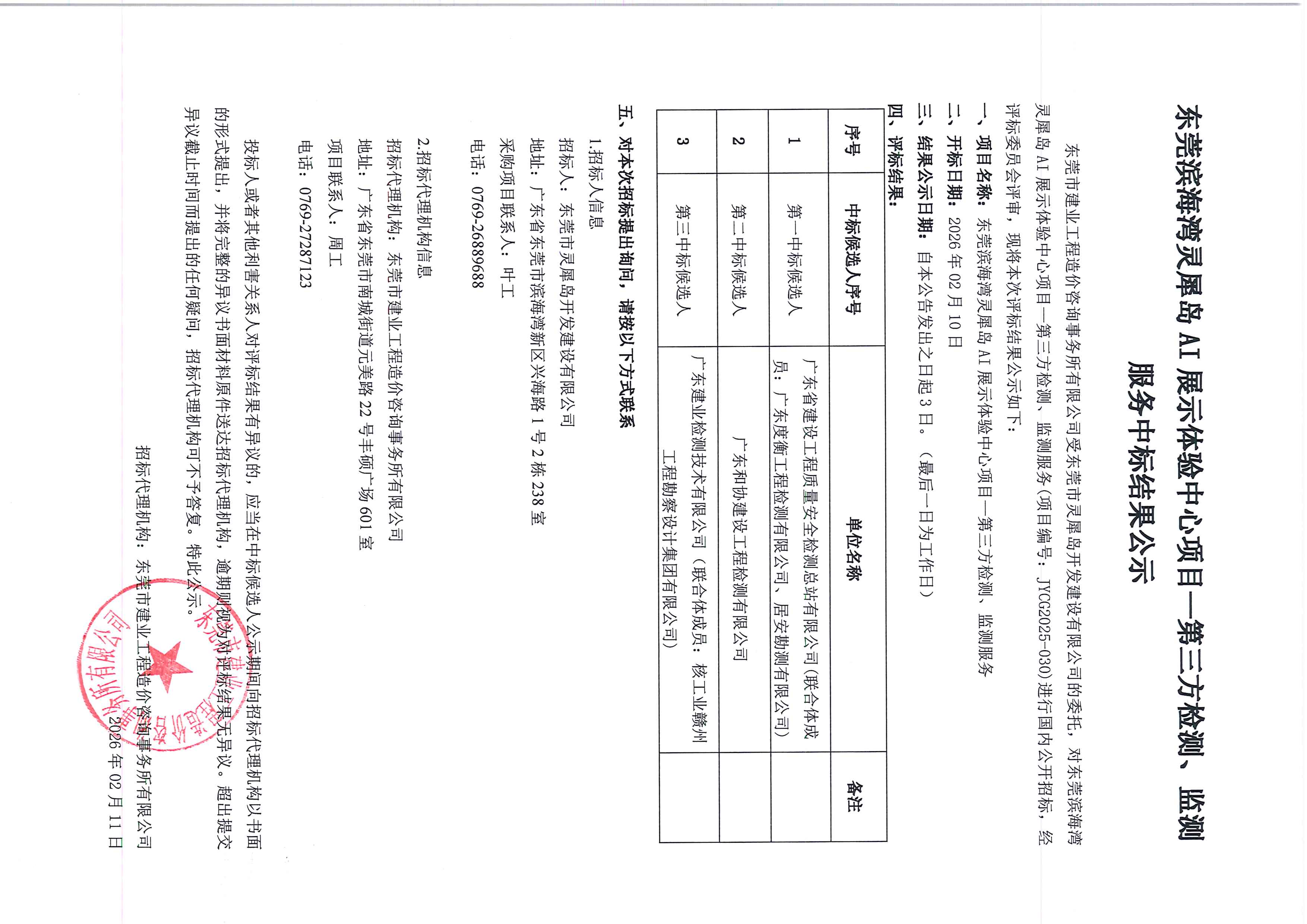 東莞濱海灣靈犀島AI展示體驗中心項目一第三方檢測、監(jiān)測服務(wù)中標(biāo)結(jié)果公示