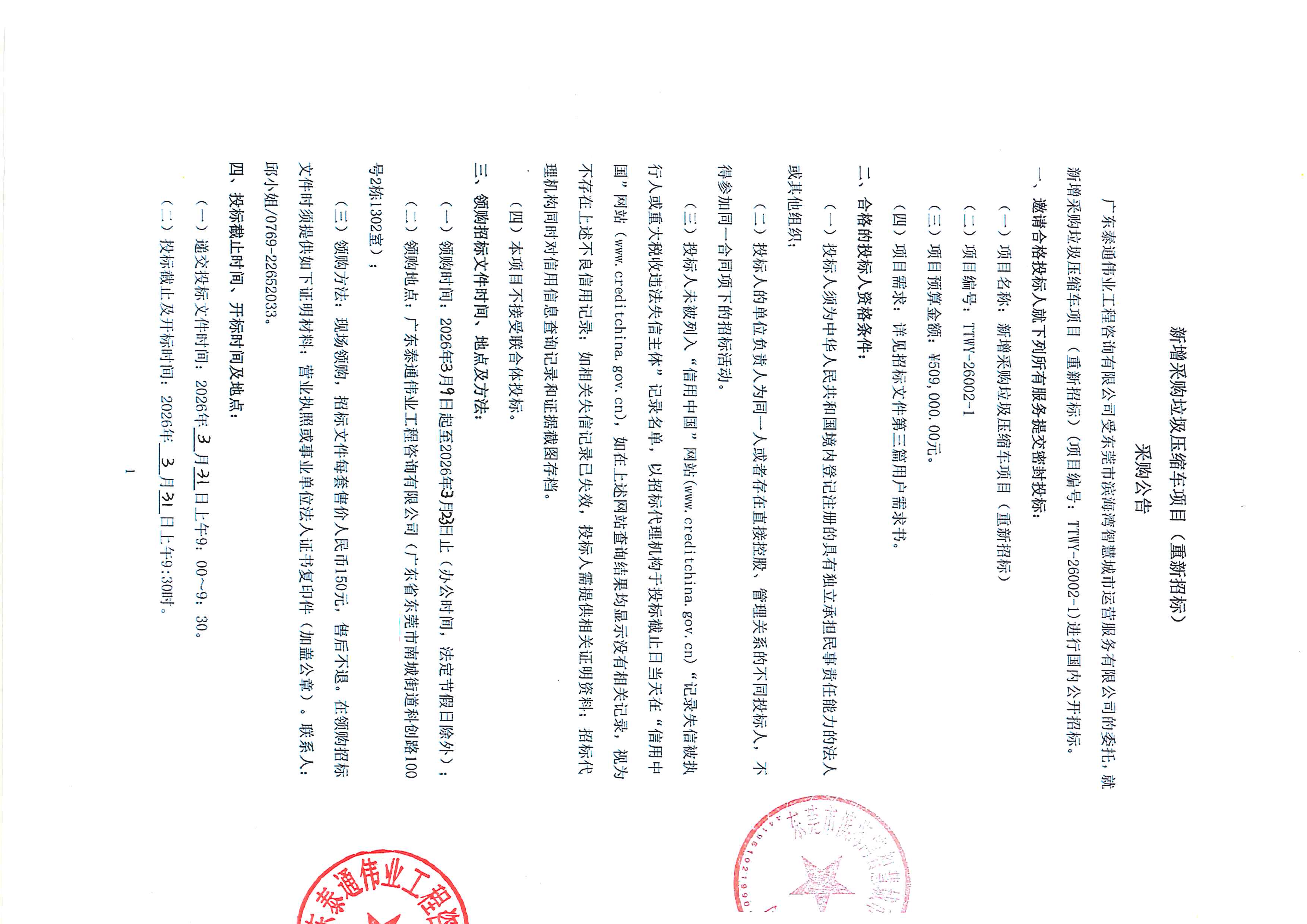 新增采購(gòu)垃圾壓縮車項(xiàng)目(重新招標(biāo))采購(gòu)公告