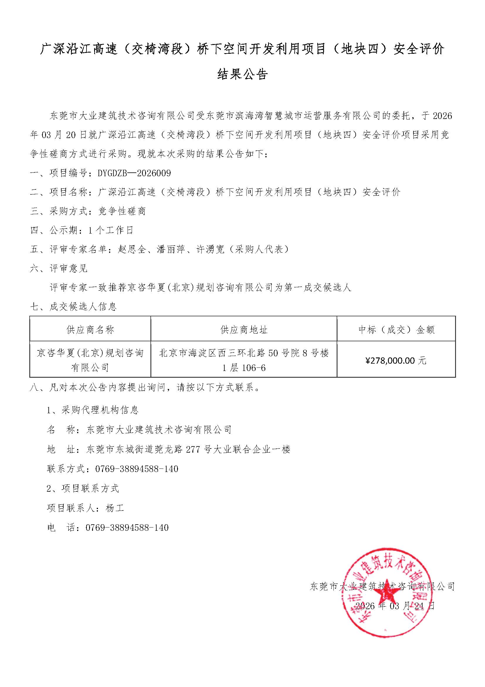 廣深沿江高速(交椅灣段)橋下空間開發(fā)利用項(xiàng)目(地塊四)安全評(píng)價(jià)結(jié)果公告