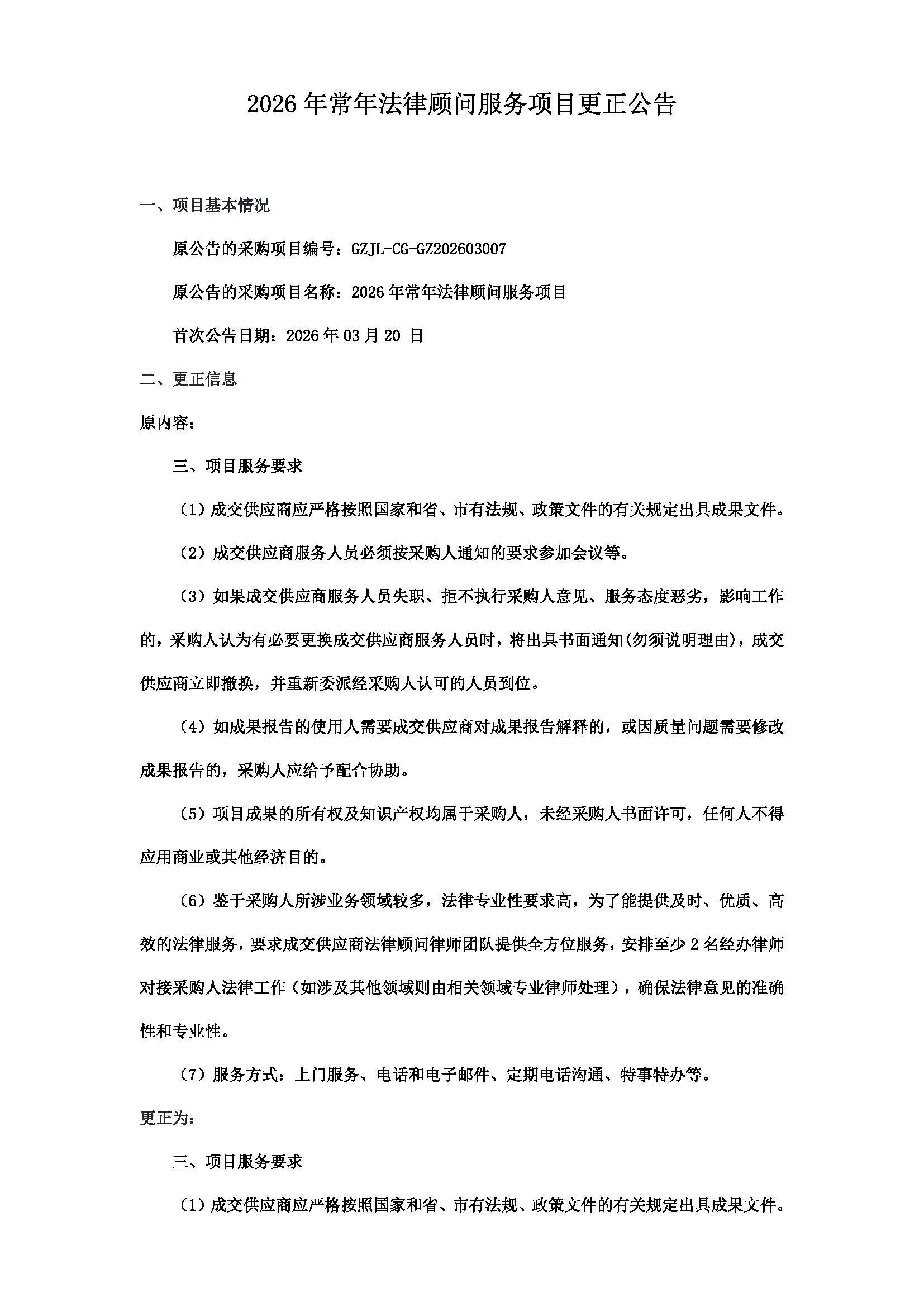 2026年常年法律顧問服務(wù)項(xiàng)目更正公告